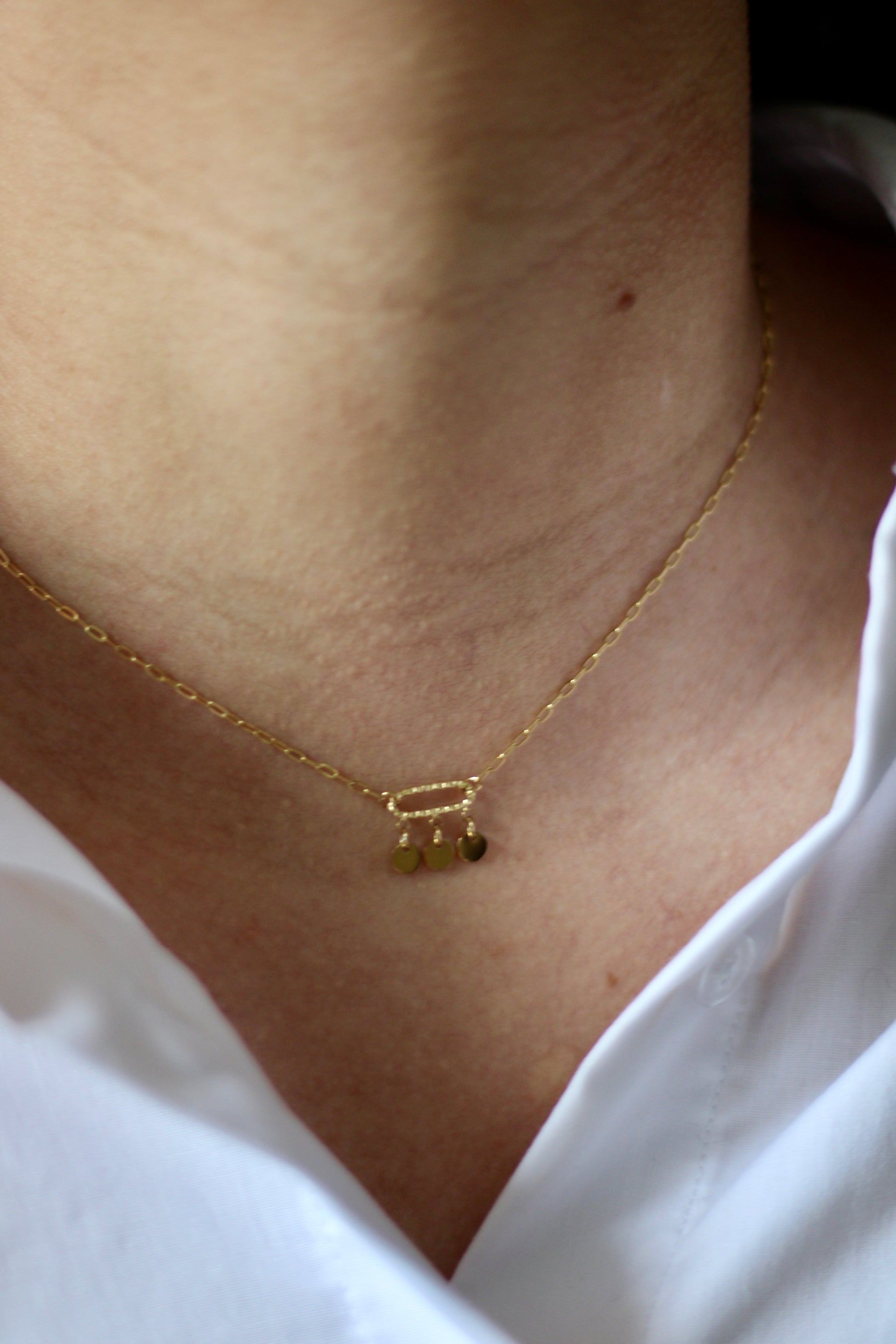 Ce bijou joue sur la verticalité et la fluidité : à chacun de vos gestes, les pastilles dorées captent la lumière et s'animent avec légèreté. Son design minimaliste et graphique en fait une pièce facile à porter seule pour un look épuré, ou à associer à d'autres colliers plus longs pour créer un effet de cascade élégant.